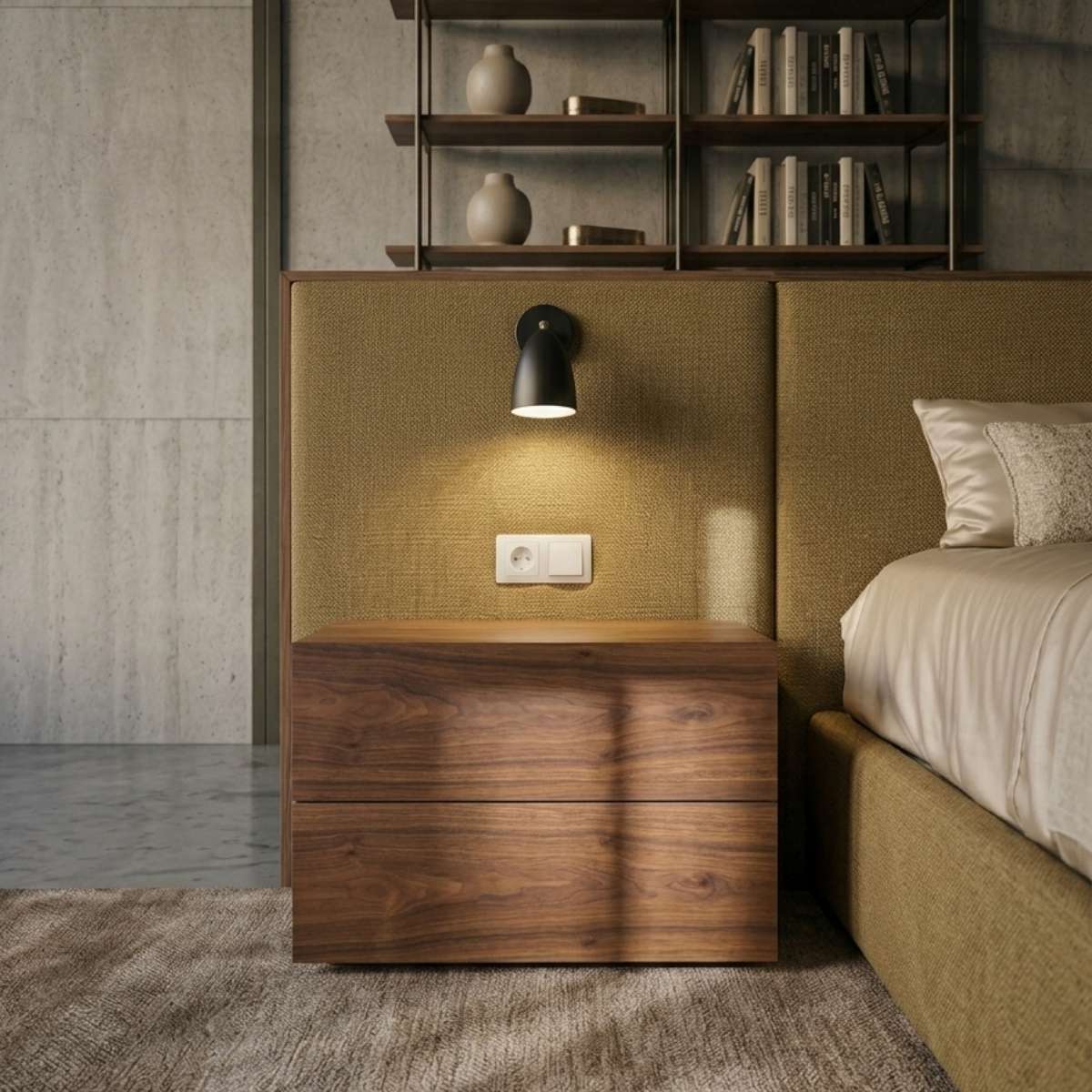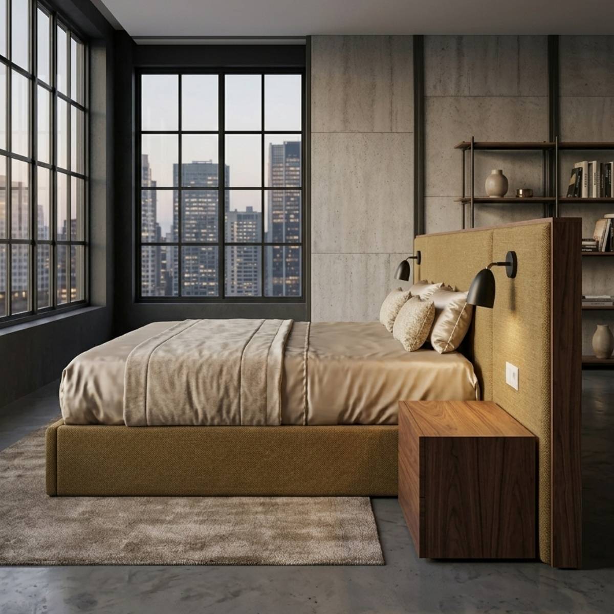Quarto de casal composto por cama e mesas de cabeceira, com estrado incluído