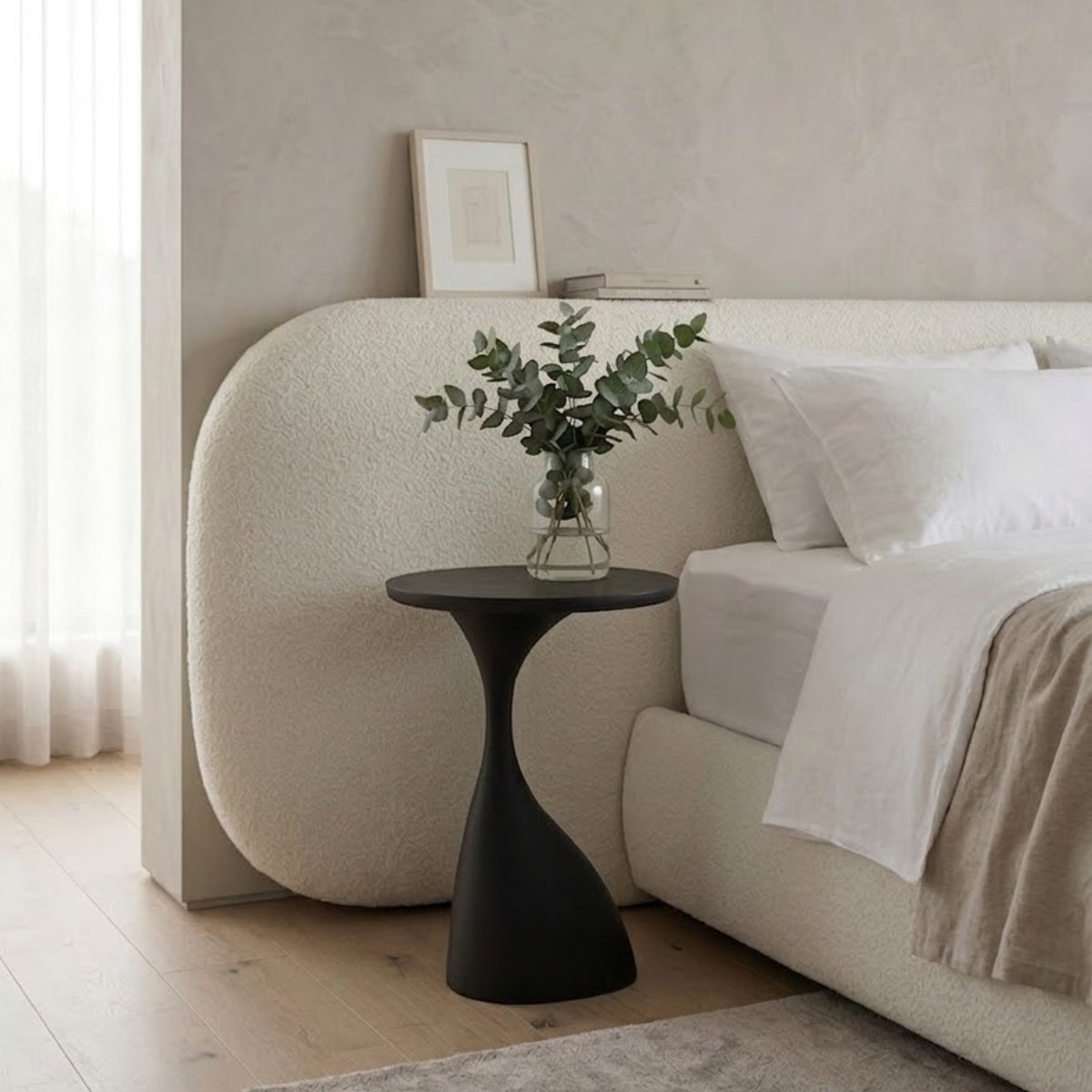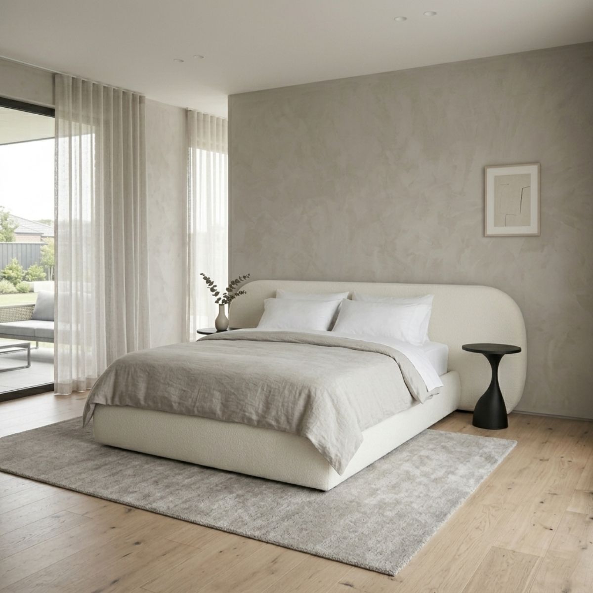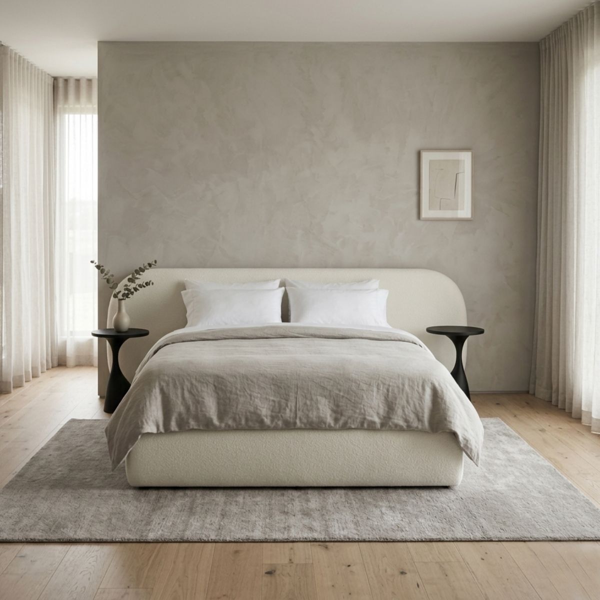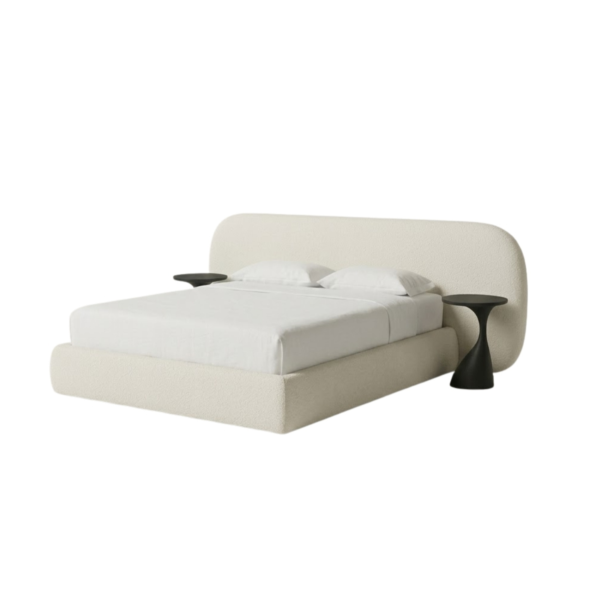 Quarto de casal composto por cama e mesas de apoio, com estrado incluído