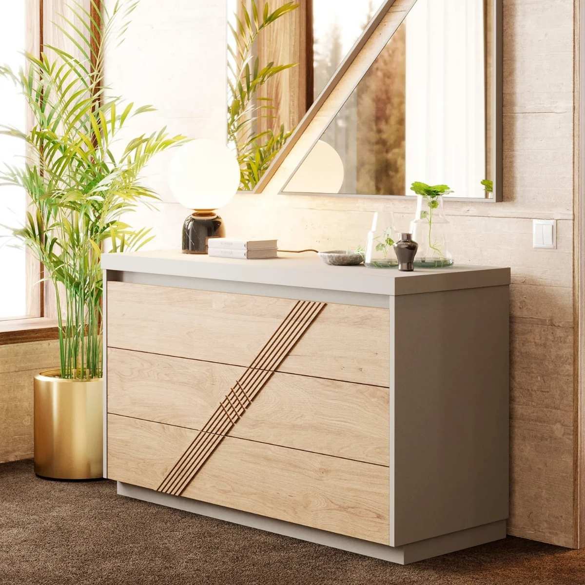 Aglomerado de madeira, MDF e folha de madeira natural.
