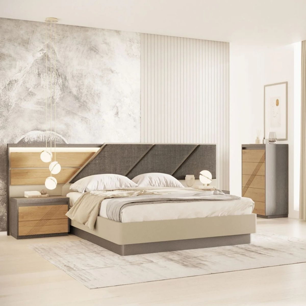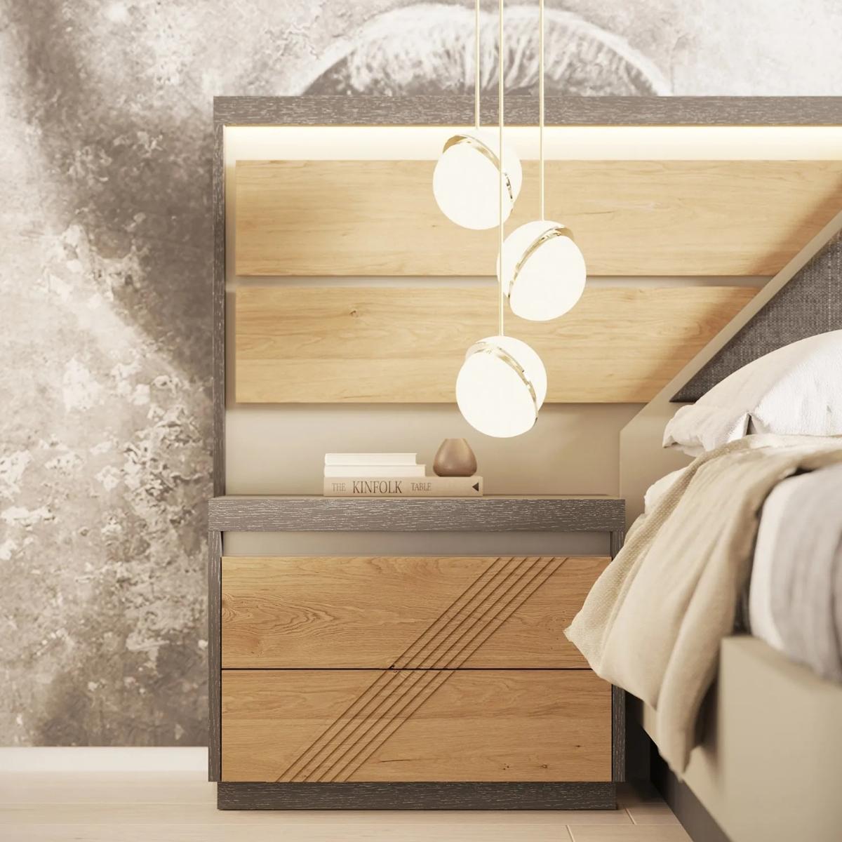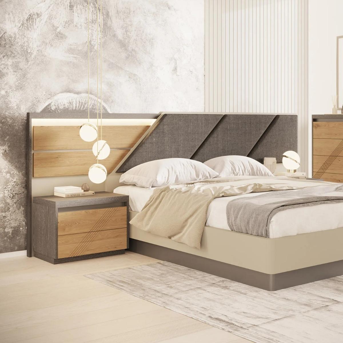 Quarto de casal composto por cama, mesas de cabeceira, cómoda e espelho, com estrado incluído