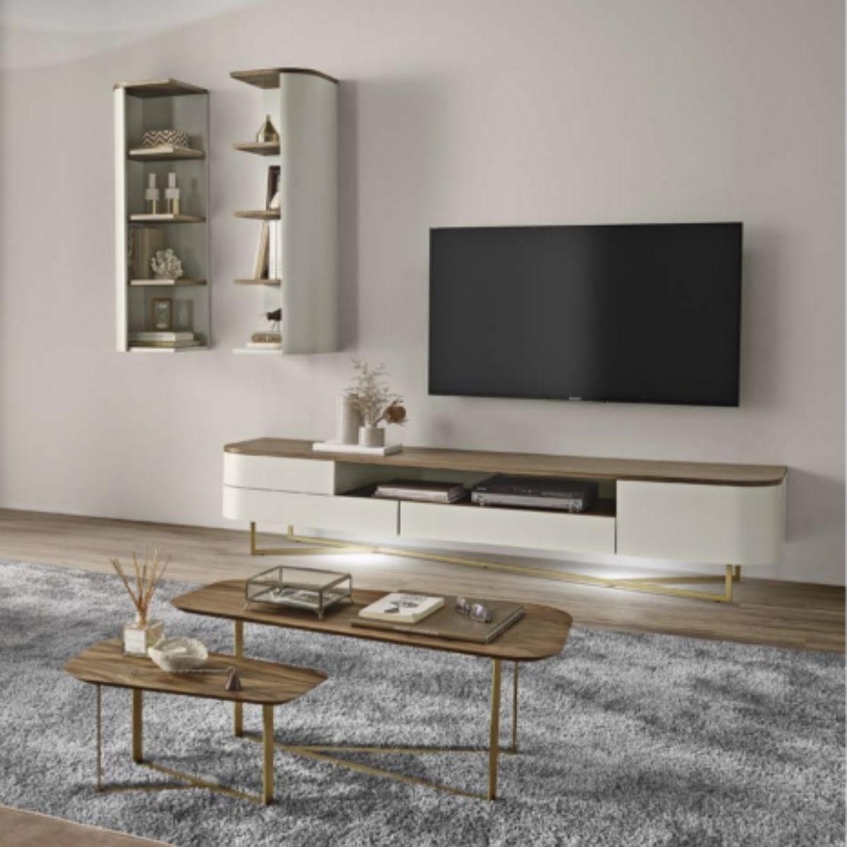 Estante composta por base tv e dois módulos suspensos