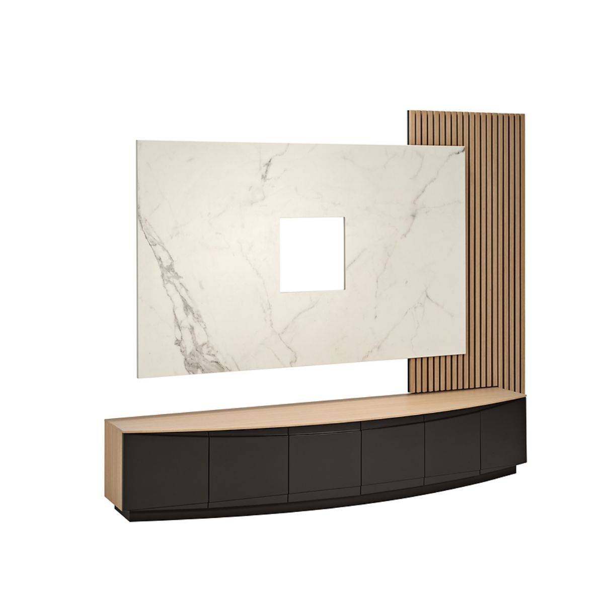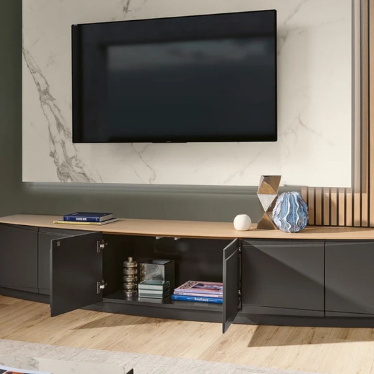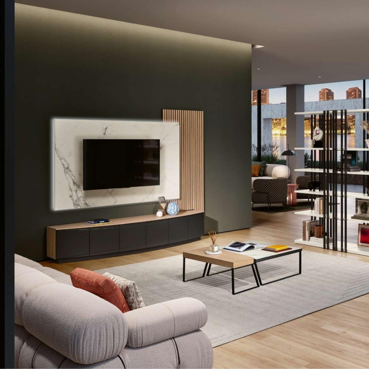 Estante composta por base tv, painel tv e painel ripado