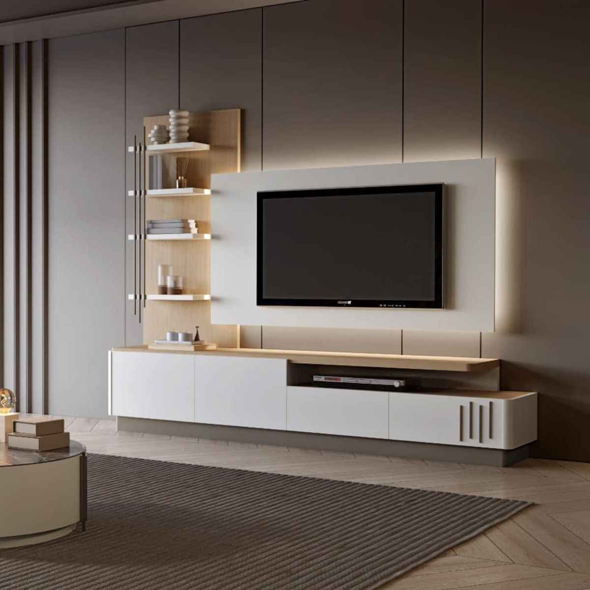 Estante composta por base tv, painel tv e painel com prateleiras